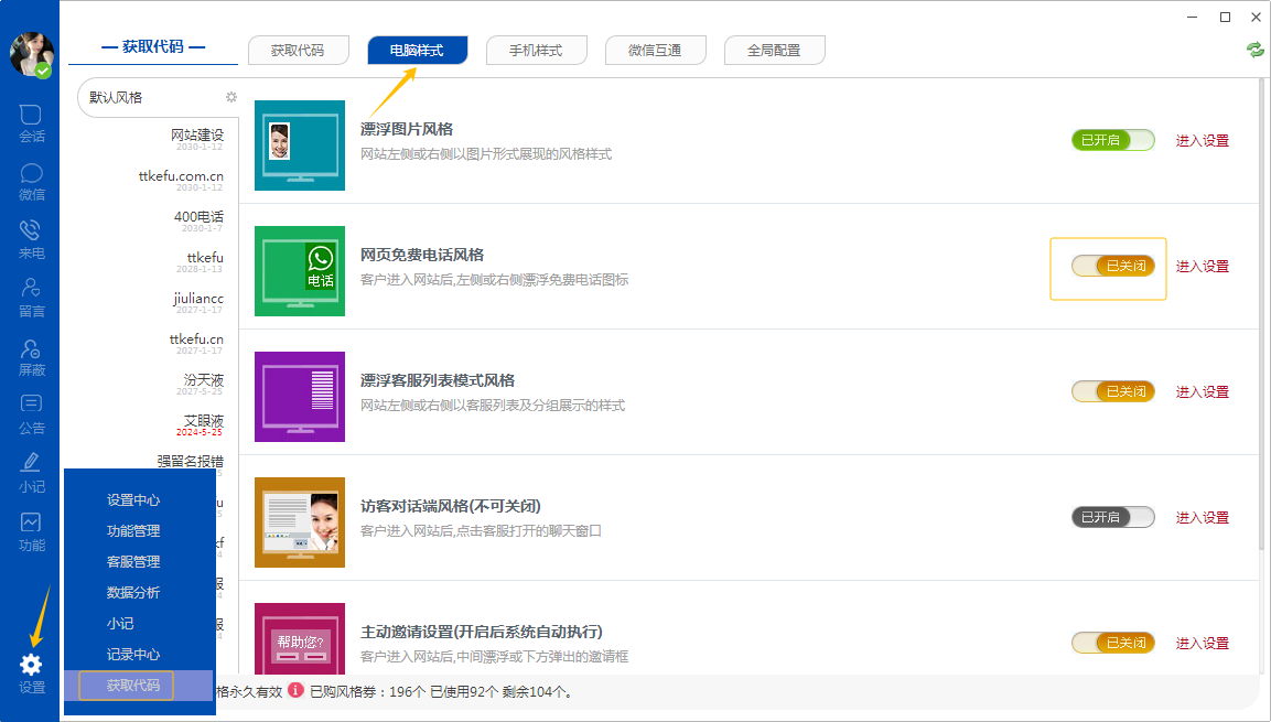 第二步:点击设置--获取代码--电脑样式---找到网页免费电话风格关闭就好了